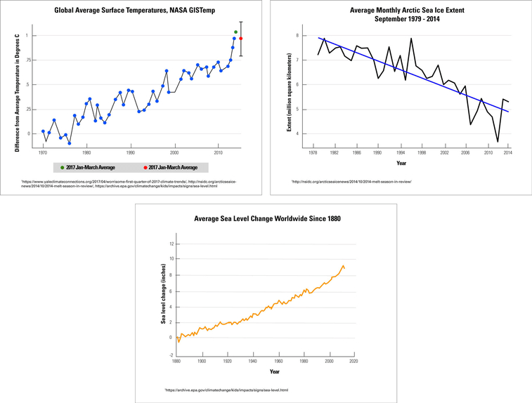 A group of scientists compared average global temperatures to the trends in Arctic sea ice and global sea levels. Graph 1 shows the differences in Earth’s average temperatures over time. Graph 2 shows the changes in the amount of Arctic sea ice in the month of September each year. In this graph, “extent” refers to how much of the surface is covered by sea ice. Graph 3 shows the changes in global sea levels over time.