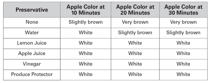 A student noticed that the apple slices she packs for a snack turn brown before she can eat them 30 minutes later. She wanted to find the best, readily available, solution to this problem. To evaluate possible solutions, she cut an apple into six slices. She dipped each slice into a different preservative for 30 seconds each, except for one slice, which she set aside. She then placed all six apple slices on paper plates. She recorded her observations in the table below.