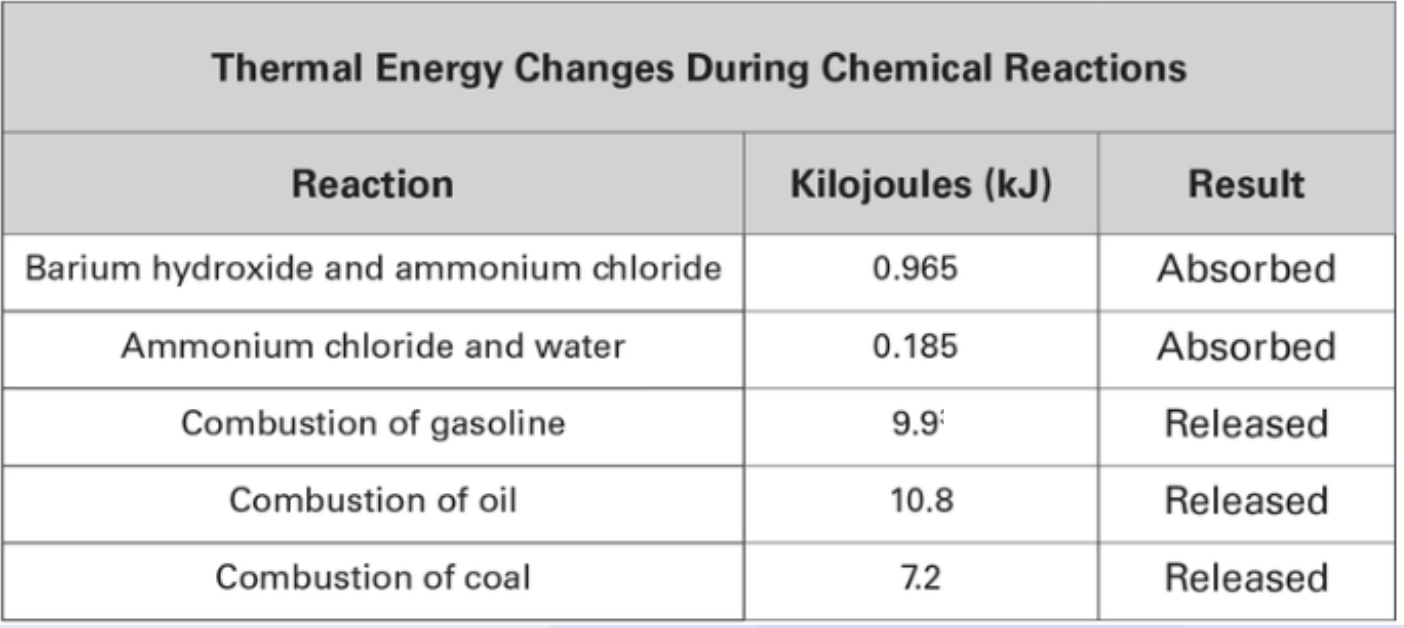 Some chemical reactions are endothermic while others are exothermic. The amount of energy that is absorbed or released in a reaction is often measured in joules (J) or kilojoules (kJ). Data was collected on a gram of different materials during reaction and presented in the chart below.