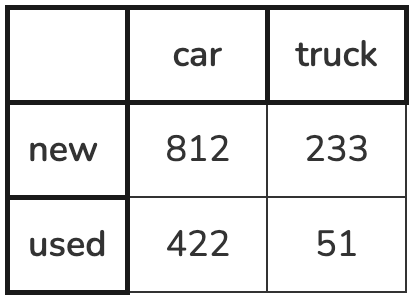 An automobile dealership keeps track of the number of cars and trucks they have for sale as well as whether they are new or used. Create a relative frequency table. Explain why you chose to use the row totals or column totals in your calculations.