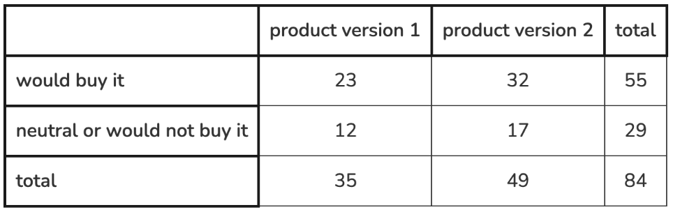 Use a relative frequency table to determine if there is an association between the product versions and whether people would buy each one. Explain your reasoning.