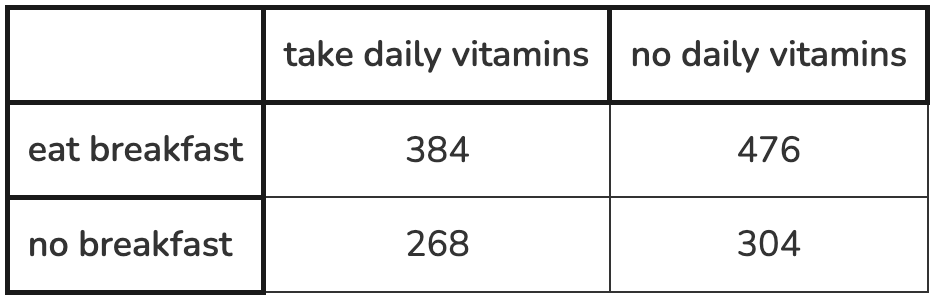 A survey is given to 1,432 people about whether they take daily supplemental vitamins and whether they eat breakfast on a regular basis. Create a relative frequency table that shows the percentage of the entire group that is in each cell.