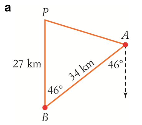 Boolean (B) is 34 km S 46° W of Axiom (A). Pascal (P) is 27 km due north of Boolean.