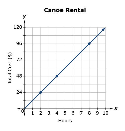 According to the graph below, write an equation that shows the relationship between the cost to rent a canoe, c, and the number of hours you rent the canoe for, h.