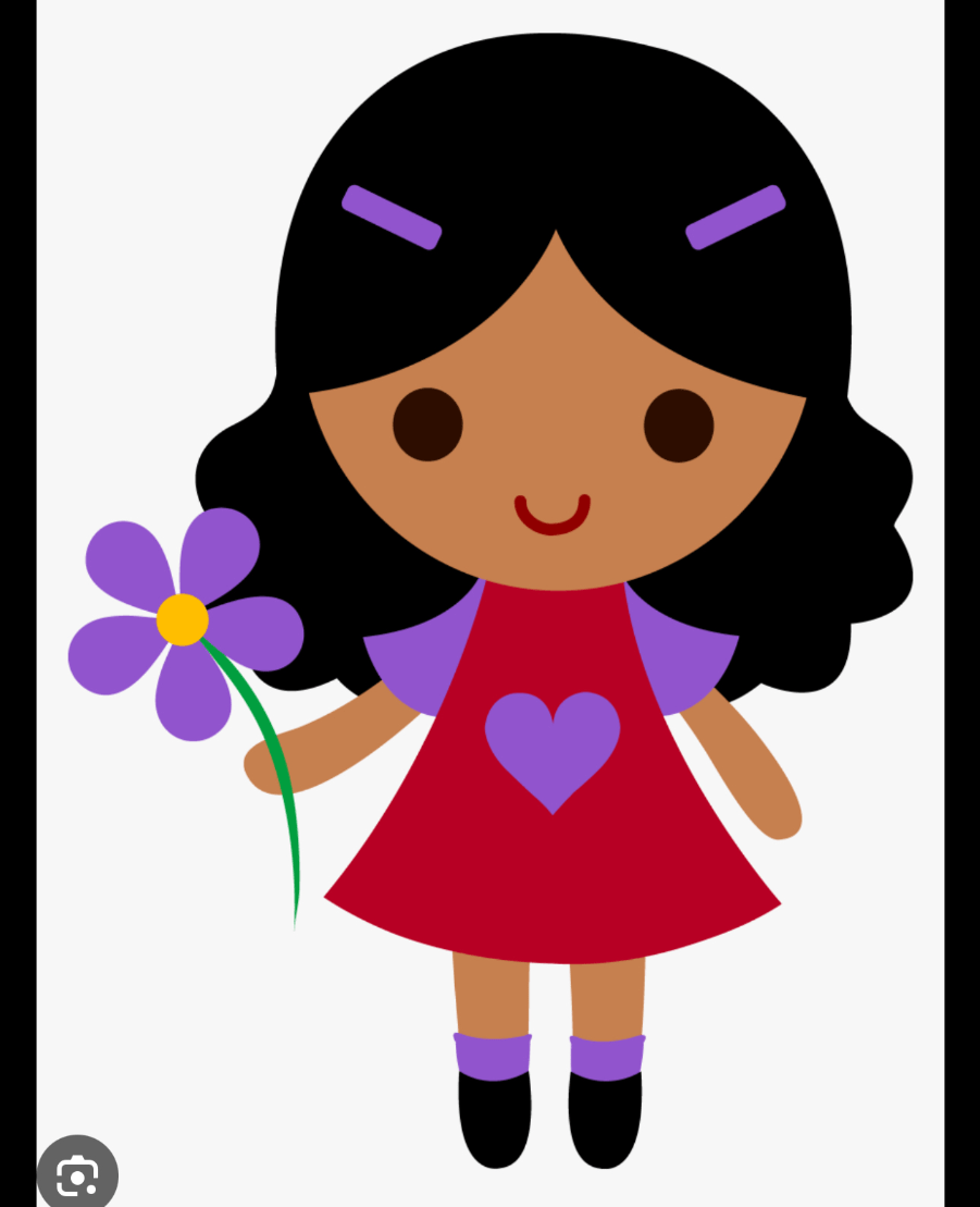 Ella tiene ojos cafés, pelo negro, vestido rojo y morado, zapatos negros, una flor morada
