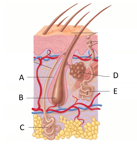apocrine sweat gland; C, eccrine sweat gland: E, and sebaceous gland: D
