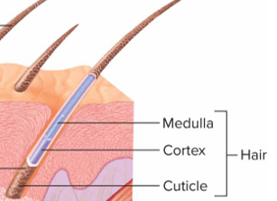 Arrange the following layers of hair from deep to superficial: cortex, cuticle, medulla.