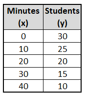 The table below shows the amount of students (y) still taking the test after a certain number of minutes (x). What function models this situation?