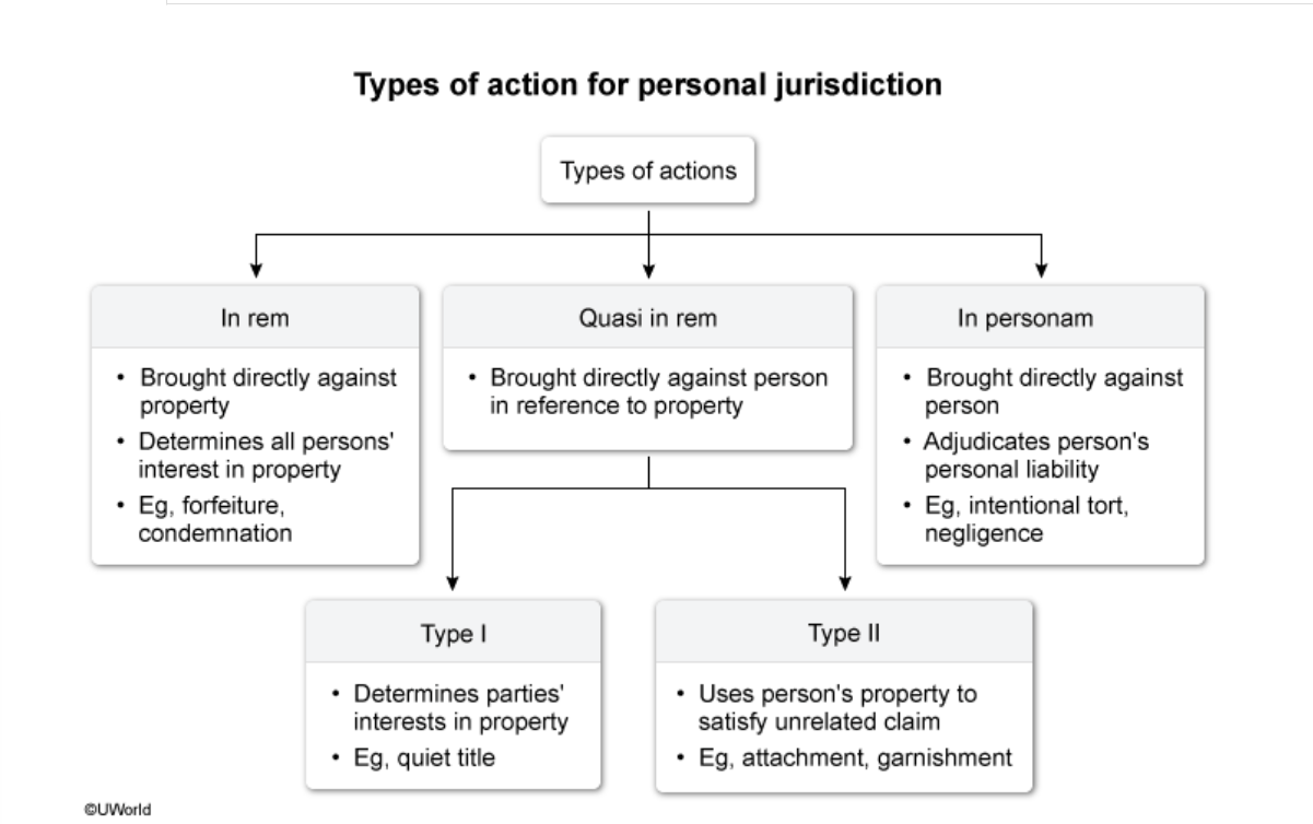 A defendant's ownership of property in the forum state establishes minimum contacts in an action related to that property. What types of actions are they?