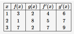 Use the table to find h'(1) if h(x)=f(g(x)).