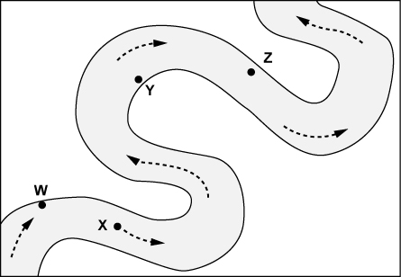 Point Y. The water flow is weaker and not able to carry rocks and sediment, so it deposits.