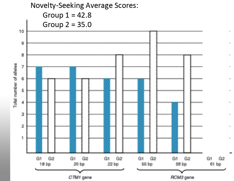 After the twin study, scientists performed an association study to determine which genes are associated with novelty-seeking. They looked at genes for high novelty-seekers and low novelty-seekers and got the following data.