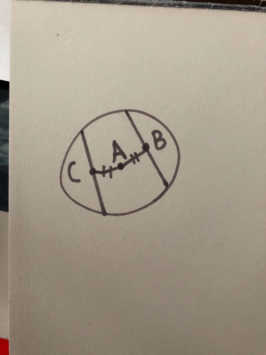 The distance between point C and A is equal to the distance between B and A. One of the two chords given in the visual is 4x-8 cm long and the other one is 2x+4 long. What is x?