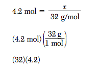 Show a numerical setup for calculating the mass, in grams, of a 4.2-mole sample of O2. Use 32 g/mol as the gram-formula mass of O2.