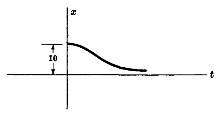 Una partícula P de masa 2 (gm) se mueve en el eje x atraída hacia el origen O con una fuerza numéricamente igual a 8x. Si inicialmente está en reposo en x = 10 (cm), encuentre su posición en cualquier momento posterior asumiendo que una fuerza de amortiguamiento numéricamente igual a 8 veces la velocidad instantánea actúa. Incluya en su respuesta la EDO, la solución y su gráfica.