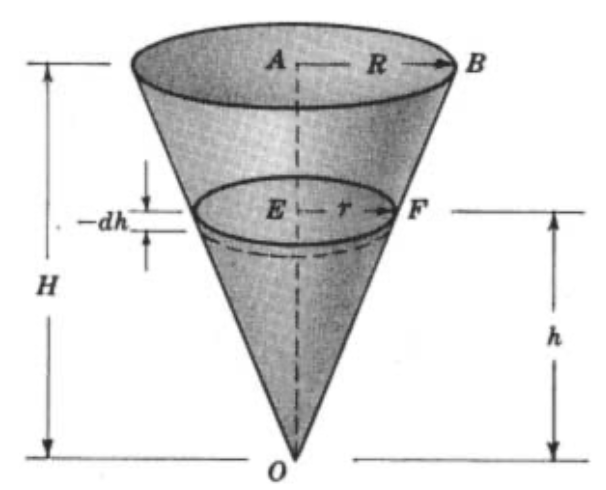 T=\frac{\pi R^2}{5ak}\sqrt{\frac{2H}{g}}