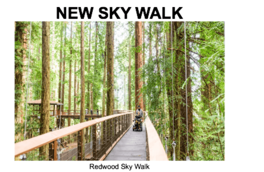 The sky walk is a series of bridges that are 100 feet about the ground. The bridges are attached to huge trees. The huge trees are redwood trees. Redwood trees are the tallest trees in the world! People can walk on the sky walk.