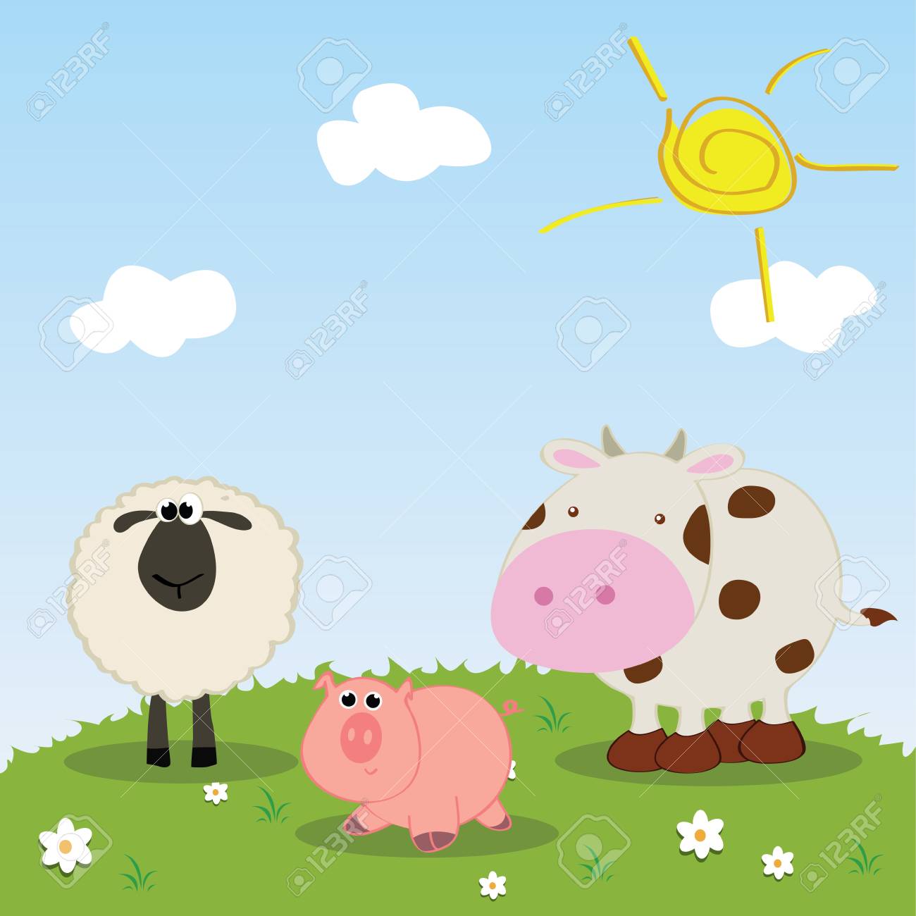 The pig is between the sheep and the cow.