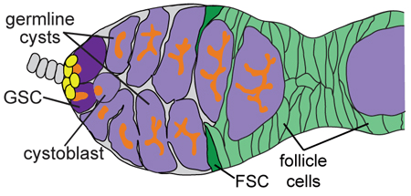 In the germarium, the cells shown in yellow are a component of the stem cell niche in the ovary.