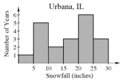 The histogram displays the amount of snowfall recorded in Urbana, IL over the years.