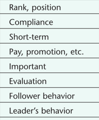 Focuses on leaders’ and followers’ self-interests. Involves an exchange in which followers work to receive benefits or to avoid penalty or punishment.