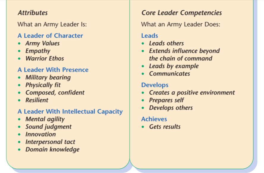 This informs everything you do and ask others to do. You demonstrate your commitment to this and to a leadership role in the Army by adopting and living the seven Army Values and the leader attributes.