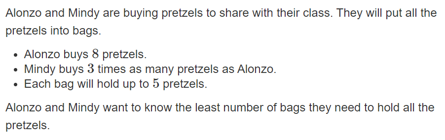 This is the number of pretzels Alonzo and Mindy have in total. **Bonus, this is how many bags would they need to hold the pretzels.
