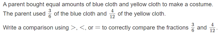 A parent bought equal amounts of blue cloth and yellow cloth to make a costume. The parent used 3/6 of the blue cloth and 4/12 of the yellow cloth. Write a comparison using >, <, or = to correctly compare the fractions 3/6 and 4/12.
