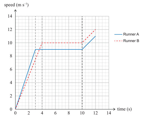 Runner A has the greater acceleration during the first 3 seconds. The gradient / slope of a speed-time graph equals the acceleration of the object. The steeper the slope, the greater the acceleration. Runner A has a steeper slope than Runner B in the first 3 seconds.