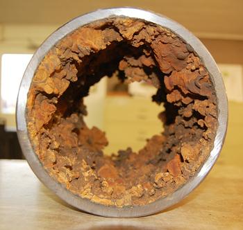 The formation of localized iron oxide corrosion products in the form of knoblike mounds.