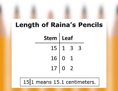 Raina measured the length of several pencils she found in her desk. She used a stem and leaf plot to organize the data. What is the difference between the length of her longest pencil and her shortest pencil?