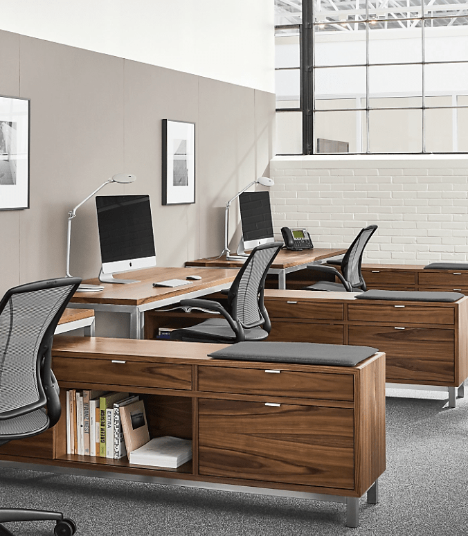This system or term is used to create office spaces with desk, storage, and possible seating. It is minimal and available on the left or right side of a desk or can be used on its own.