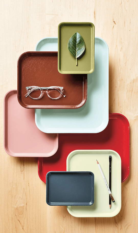 Reminiscent of old cafeteria trays, these fiberglass trays are offered in retro colors and can be used anywhere as a stylish catch-all.