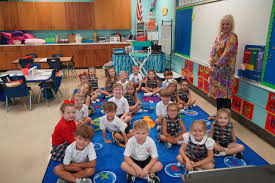 Children begin elementary school with kindergarten (grade K) around age 5. The next year is grade 1 and it goes up each year to grade 5. They finish elementary school around age 10.