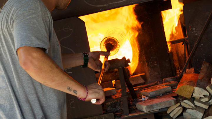 A: The opening in a glassmaking furnace for fuel.