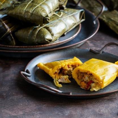 Um guisado envolto em uma massa empacotada em folhas de bananeira.