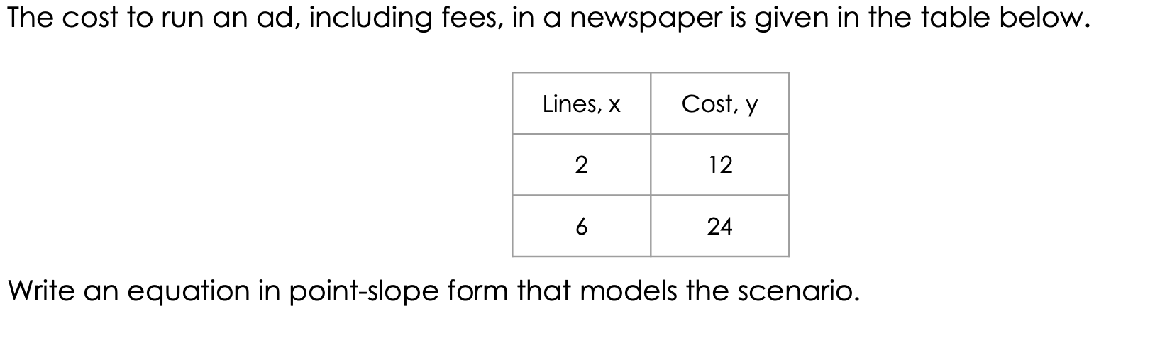 Write an equation using Slope-Intercept Form, Standard Form, or Point-Slope Form.