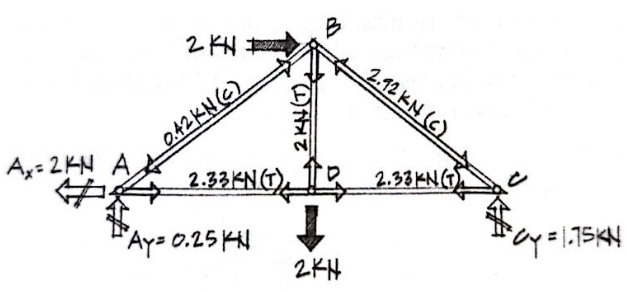 Hint: Ax = 2 kN, Ay = 0.25 kN, Cy = 1.75 kN