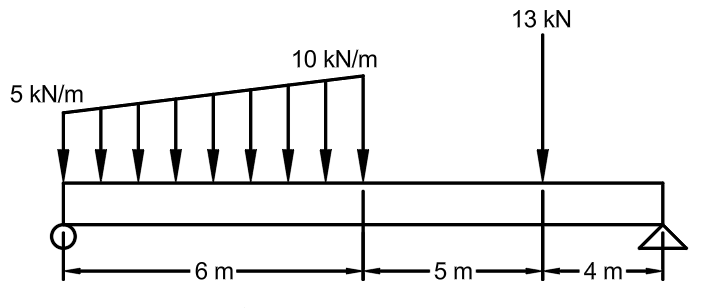 For the following beam, state the number of equations of equilibrium, the number of unknown support reactions, and then classify it as statically determinate, unstable, or statically indeterminate. If indeterminate, state to what degree.