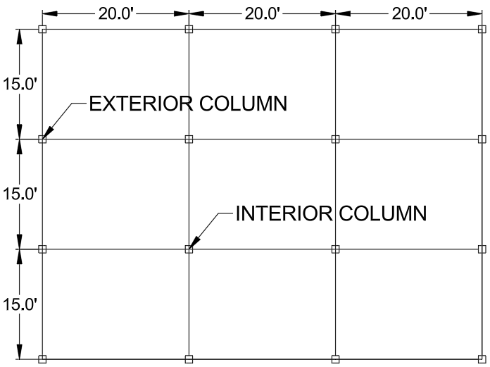 Exterior column: Tributary area = (15 ft / 2) × (20 ft / 2) = 7.5 ft × 10 ft = 75 ft² → Load = 75 ft² × 40 psf = 3,000 lb.