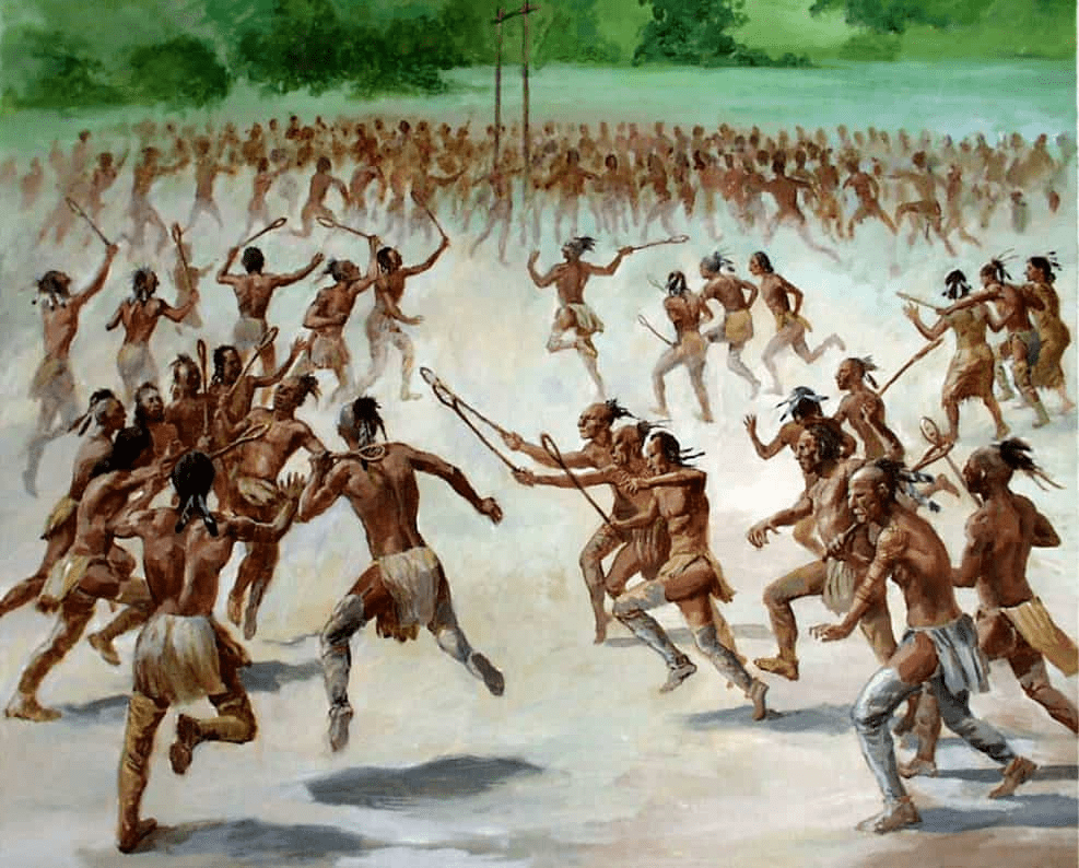 The Iroquois invented the game being played below. They used basket-topped sticks, and games could last days and include up to a 1,000 players per team. Was used as a training exercise for warriors.