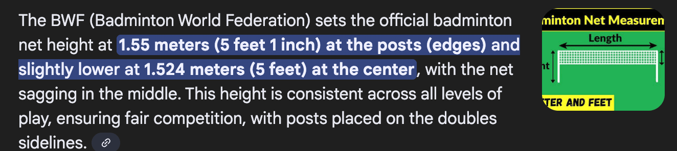 The official height of a badminton net at the posts.