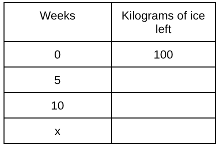 x=12. After 12 weeks, the kiosk will have 22 kg of ice remaining.