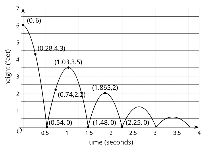 A ball bounces several times after it is dropped. The graph shows the height of the ball, in meters, t seconds after it is dropped.