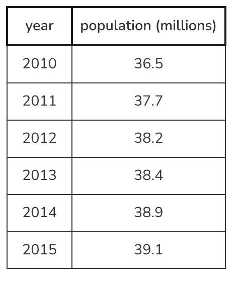 This table shows the population of a country between years 2010 and 2015. What is the average rate of change between the years 2010 and 2014?