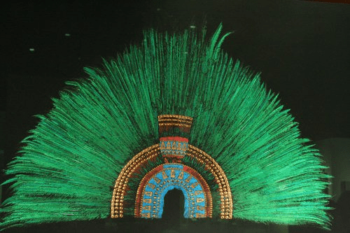 Ruler's Feather Headdress (probably of Moctezuma ll); Medium: Feathers (Quetzal and Cotinga) and gold; Culture: Aztec; Date: 1428-1520 AD, replicated 1940 AD.