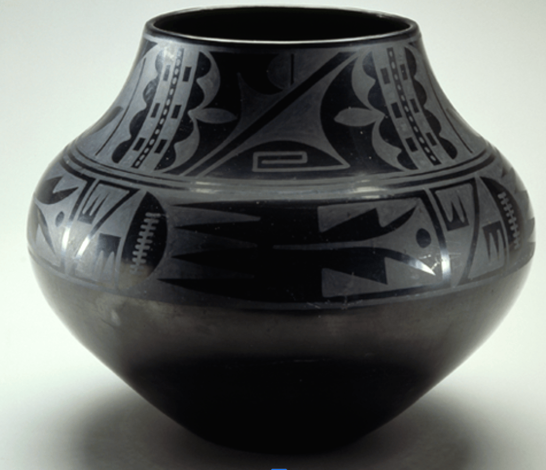 Black-on-Black Ceramic Vessel; Medium: blackware ceramics; Artist: MARIA MARTINEZ & JULIAN MARTINEZ; Culture: Puebloan (Tewa); Location: San Ildefonso Pueblo, New Mexico; Date: c. 1939 AD