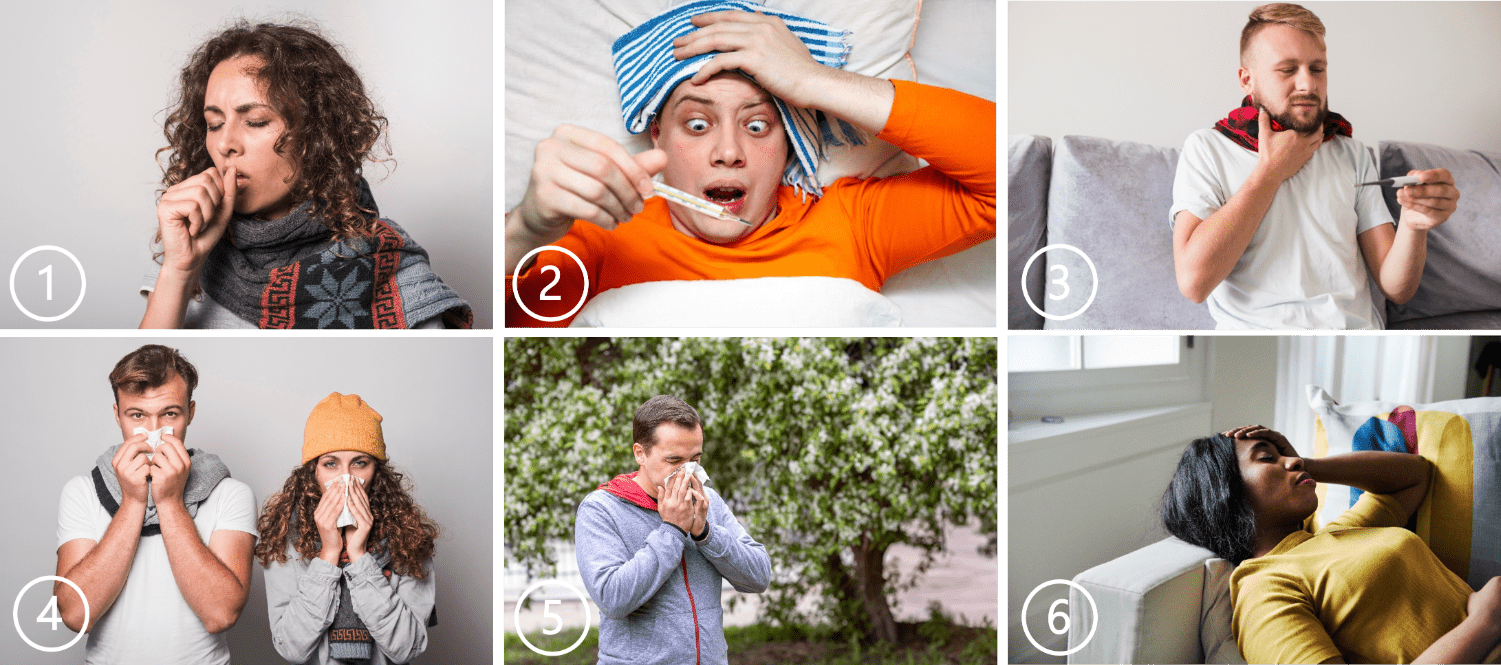 У неё кашель. У него температура. У него болит горло и температура. У них насморк. У него аллергия на пыльцу. У неё болит голова (мигрень).