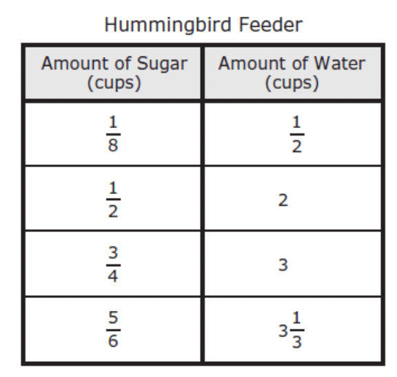 The table shows the amount of sugar Felisha mixes with each amount of water she puts in her hummingbird feeder.