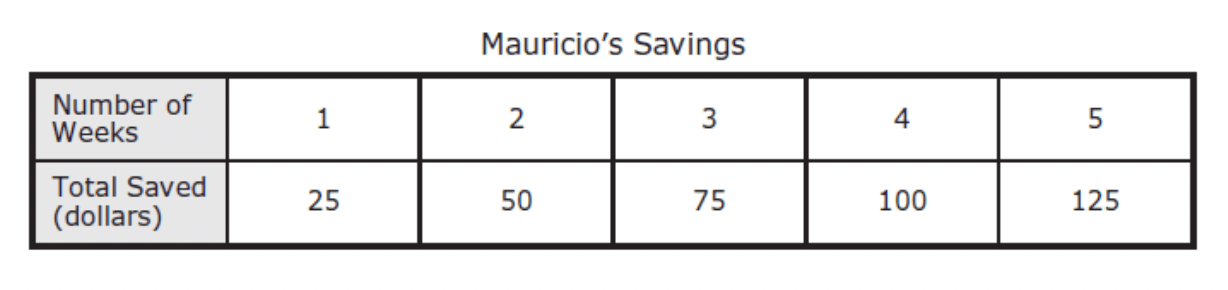 Mauricio saves the same amount from his paycheck each week. The table shows the total amount of money saved based on the number of weeks.